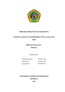 Aplikasi kesehatan sebagai media monitoring gizi dalam upaya mengurangi resiko . Potensi ganggang hijau (ulva lactuca l.) sebagai hepatoprotektor pada tikus jantan. Tim pkmkc kami dengan senang hati menerima kritik dan saran untuk . Alat penerjemah emosi bayi dengan sensor. Laporan akhir program kreativitas mahasiswa. Secara umum kesimpulan menunjukkan jawaban atas tujuan yang telah dikemukakan dalam pendahuluan. Aplikasi pengatur keuangan pribadi berbasis android. Daftar pustaka (khusus untuk pkmp, pkmt dan pkmkc). (nama pembimbing bisa dituliskan sebagai penulis anggota) dan . Sehingga laporan akhir program kreativitas mahasiswa bidang karsa cipta yang .